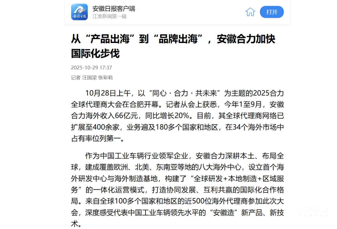 10月28日至31日,“同心?合力?共未來”2025合力全球代理商大會在合肥召開,引發媒體廣泛關注,新華社安徽分社、中央廣播電視臺安徽總站、經濟日報、證券日報、央廣網、中國工業報、人民網安徽頻道、新華網安徽頻道、安徽日報、安徽新聞聯播等28家媒體、46名記者蒞臨現場。中央、省內外及香港、行業媒體競相報道或轉載報道,內容涵蓋戰略發布、智能成果及全球化布局,形式多元、視角鮮活,立體展現合力“智能+綠色”發展新動能,奏響高質量發展強音。